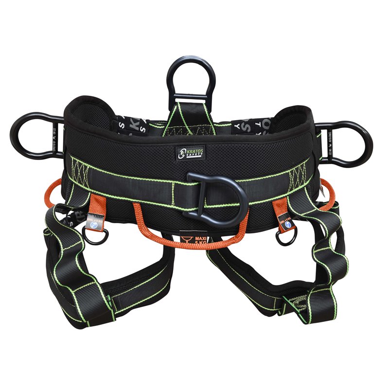 Der Kratos Safety Sitzgurt FLY’IN 4 mit einem ventralen D-Ring für Seilzugangstechnik sowie zwei seitlichen Halteösen (D-Ringe) zur Arbeitsplatzpositionierung. Der Sitzgurt verfügt über Kombinationsschnallen für eine leichte Anpassbarkeit. Zudem befinden sich drei extra große Griffe am Rücken, um Karabiner und Zubehör zu verstauen. Der Sitzgurt ist dank dem rückseitigen Verankerungsring besonders für die Arbeit mit Rückhaltesystem und für alle seilgesicherten Einsätze geeignet. Der Kratos Safety Sitzgurt FLY’IN 4 kann von einem Benutzer mit einem maximalen Gewicht von 140 kg verwendet werden.